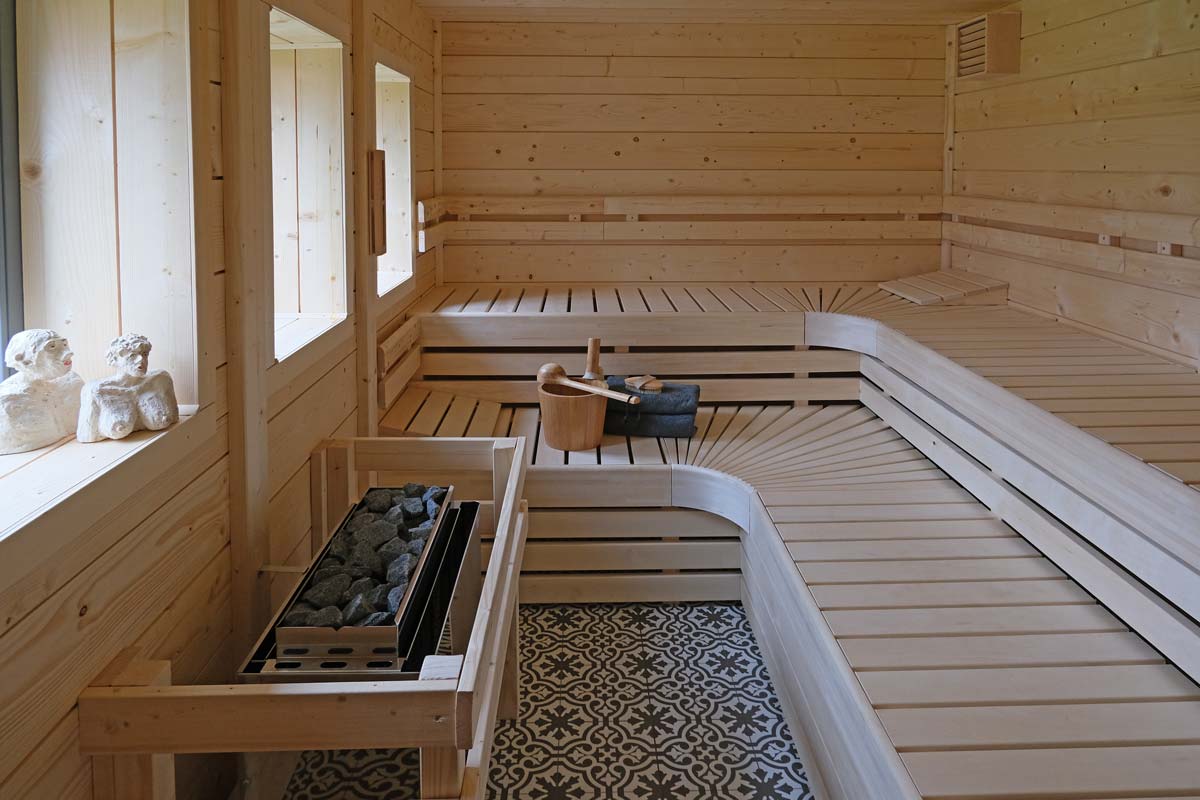 Die finnische Sauna eröffnet den Blick auf umliegende Wiesen und ein Spreewaldfließ. Nach einer ausgiebigen Wanderung können Sie in privater Atmosphäre auf dem warmen Holz entspannen und so richtig abschalten. Für die Ruhephasen erwarten Sie unsere schwebenden Wellnessliegen.